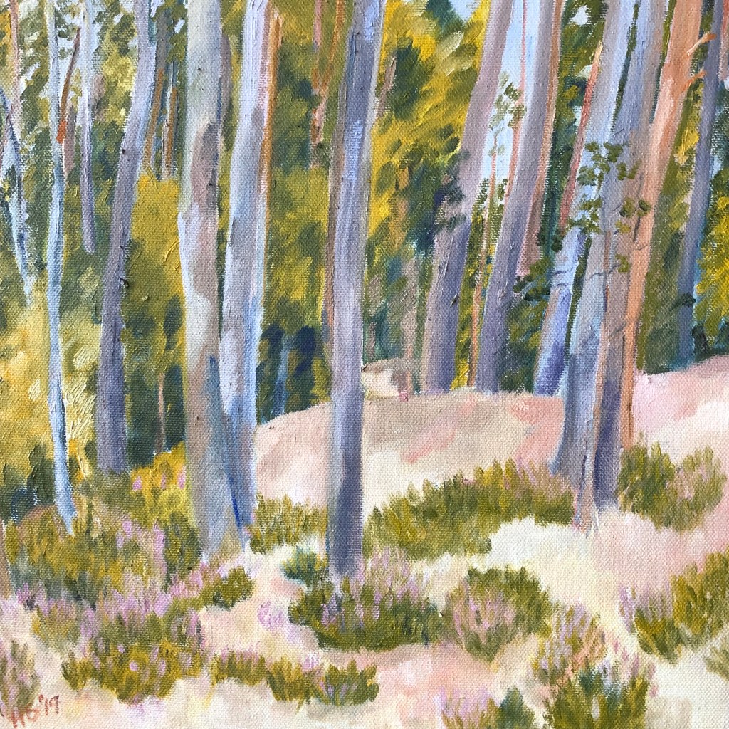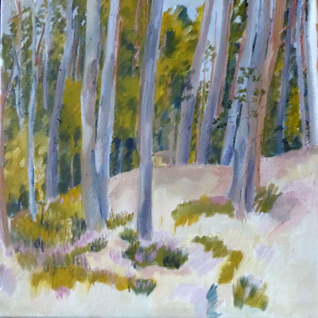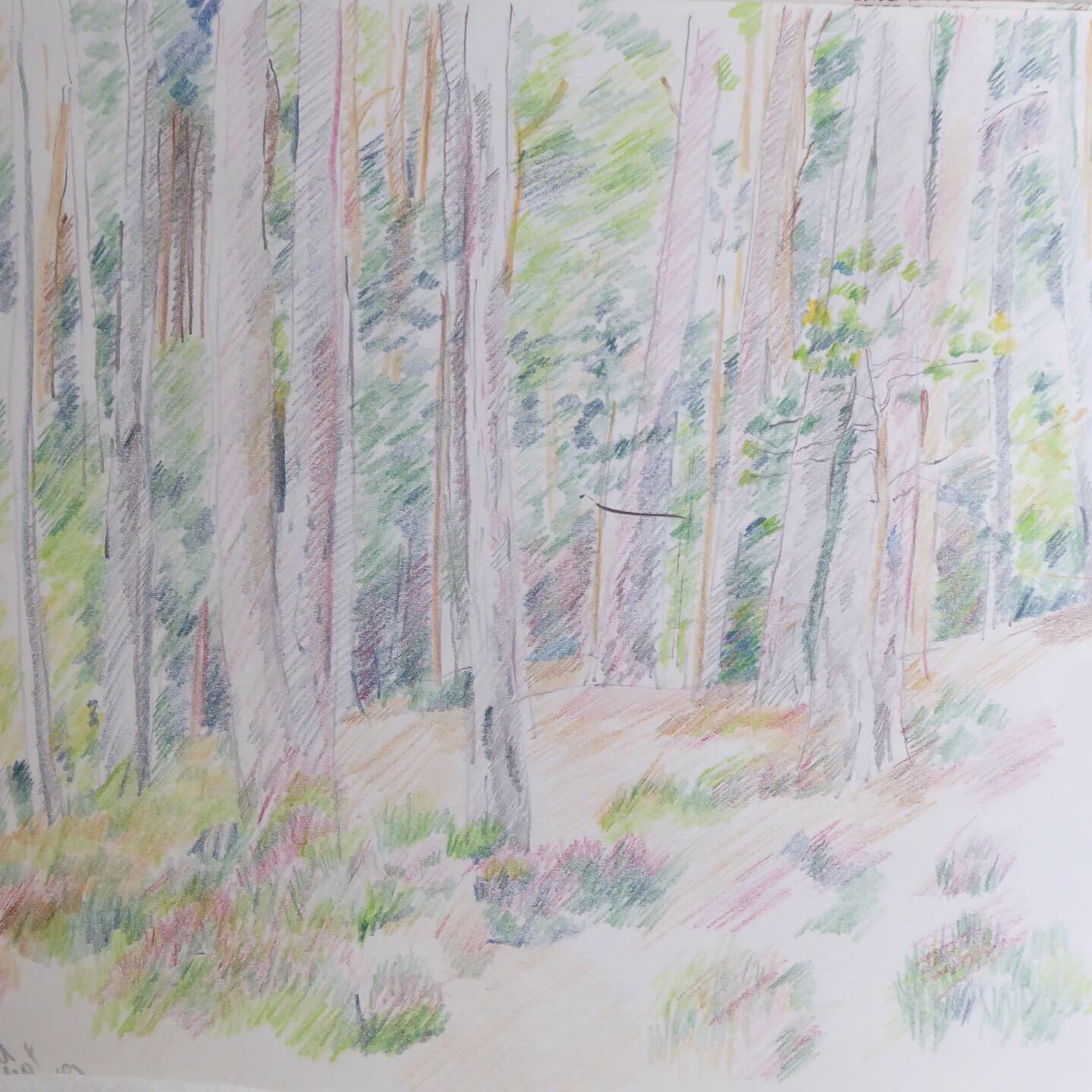 This is the initial coloured pencil sketch done while sitting on the shores of the loch. At first glance the tree trunks appear uniformly grey. In reality though they contain hints of pink, green and soft purple, reflecting the heather on the forest floor.