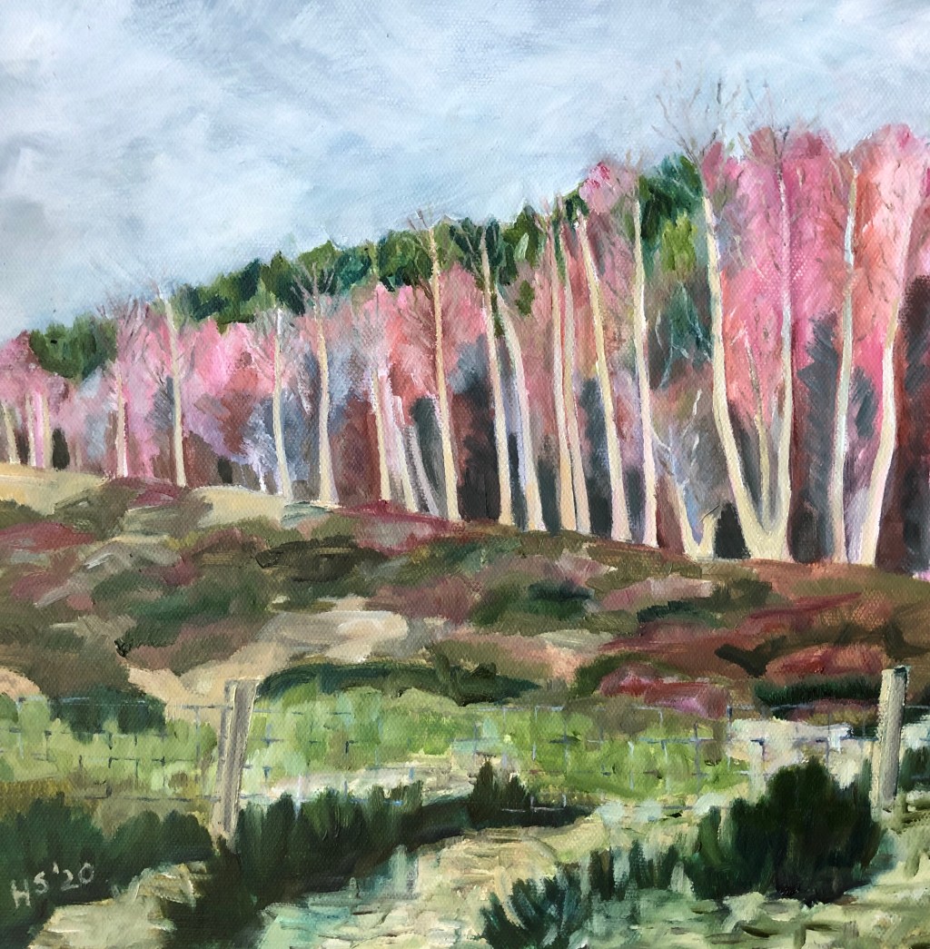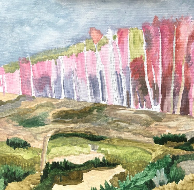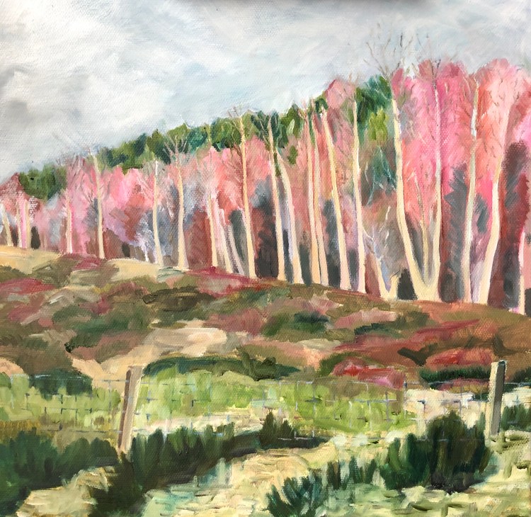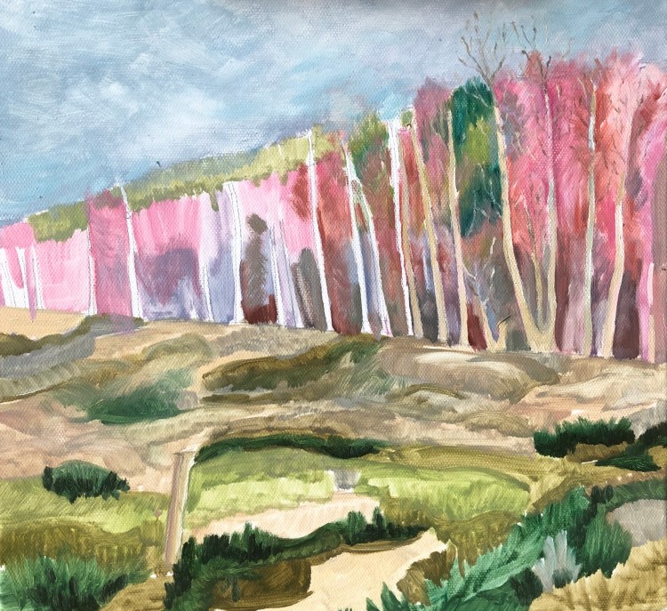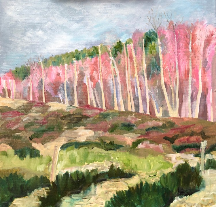 The appeal of this image is the patterns and shapes created by the line of birch trees between the heather and the conifers in the distance. I’m planning a more abstract finish to this piece, which is something of a change for me. I debated using acrylic rather than oil but decided in the end on oil, mostly because of the range of colours at my disposal.