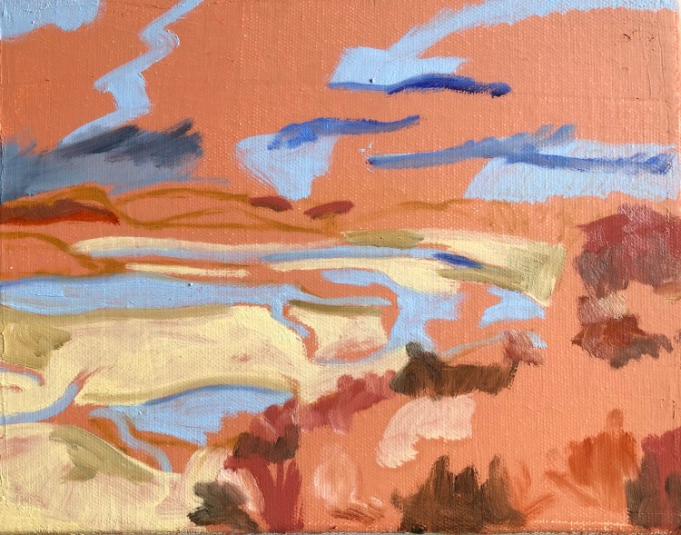 This is the view from the rather splendid glass-walled viewing hut provided by the RSPB. The images below chart progress on my attempt to capture the beauty of the marshes. The plain looks empty but is teeming with bird life. The image at the top left is the original watercolour sketch.