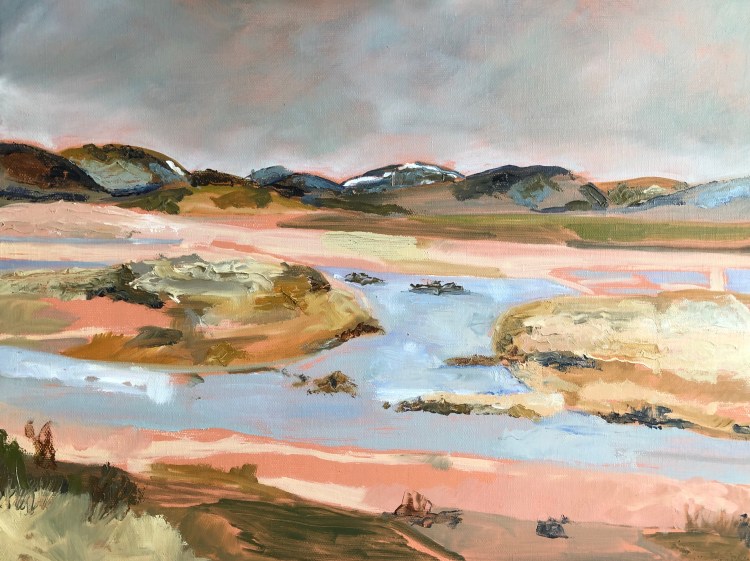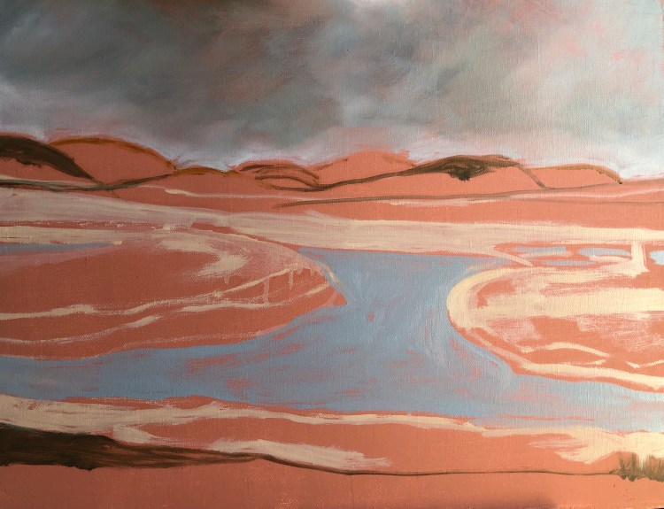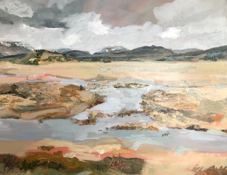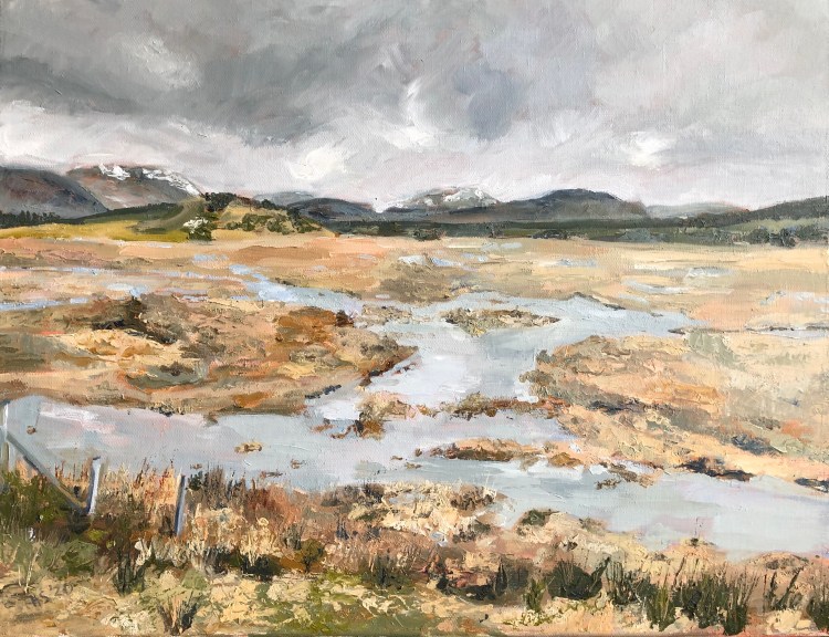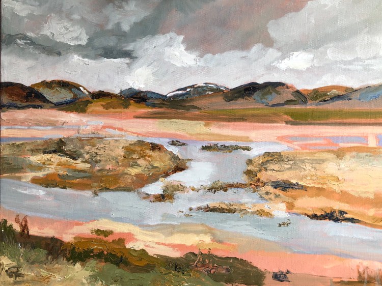 Most of the canvas ground has been covered and more of the detail has been executed. I’m happy with the sky which is not too heavy with a hint of the ground colour still visible where the pigment is lightest. I’ve made good use of the palette knife to create the reed beds and in the immediate foreground. Just some work remains to be done on the middle distance and maybe the mountains in the distance. Hints of the canvas ground colour can still be in the water, and throughout the piece, helping to tie the painting together.