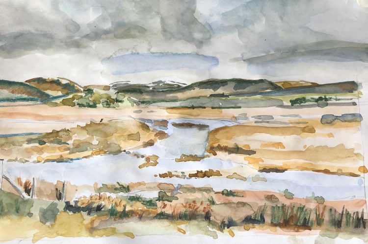Staying with Insh Marshes for my next painting: this is the watercolour sketch that I will be working from for the initial layout. In contrast to the previous painting, which was taken from the hillside looking down onto the plain, this view is taken from a lower perspective. See below for progress to the finished piece.