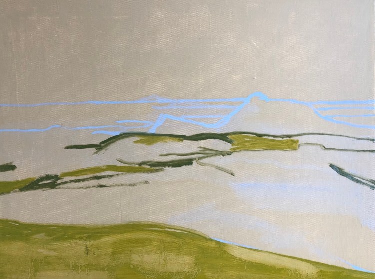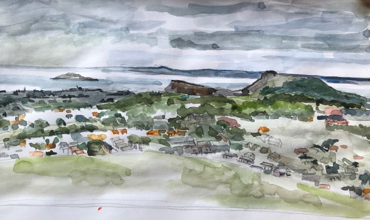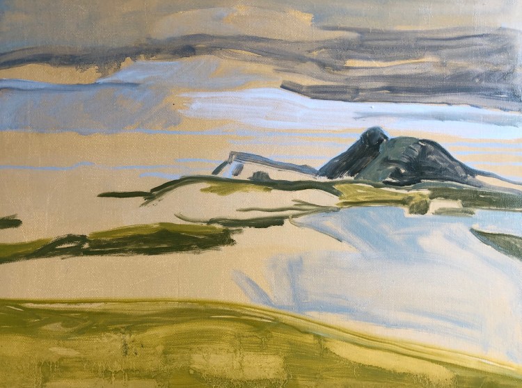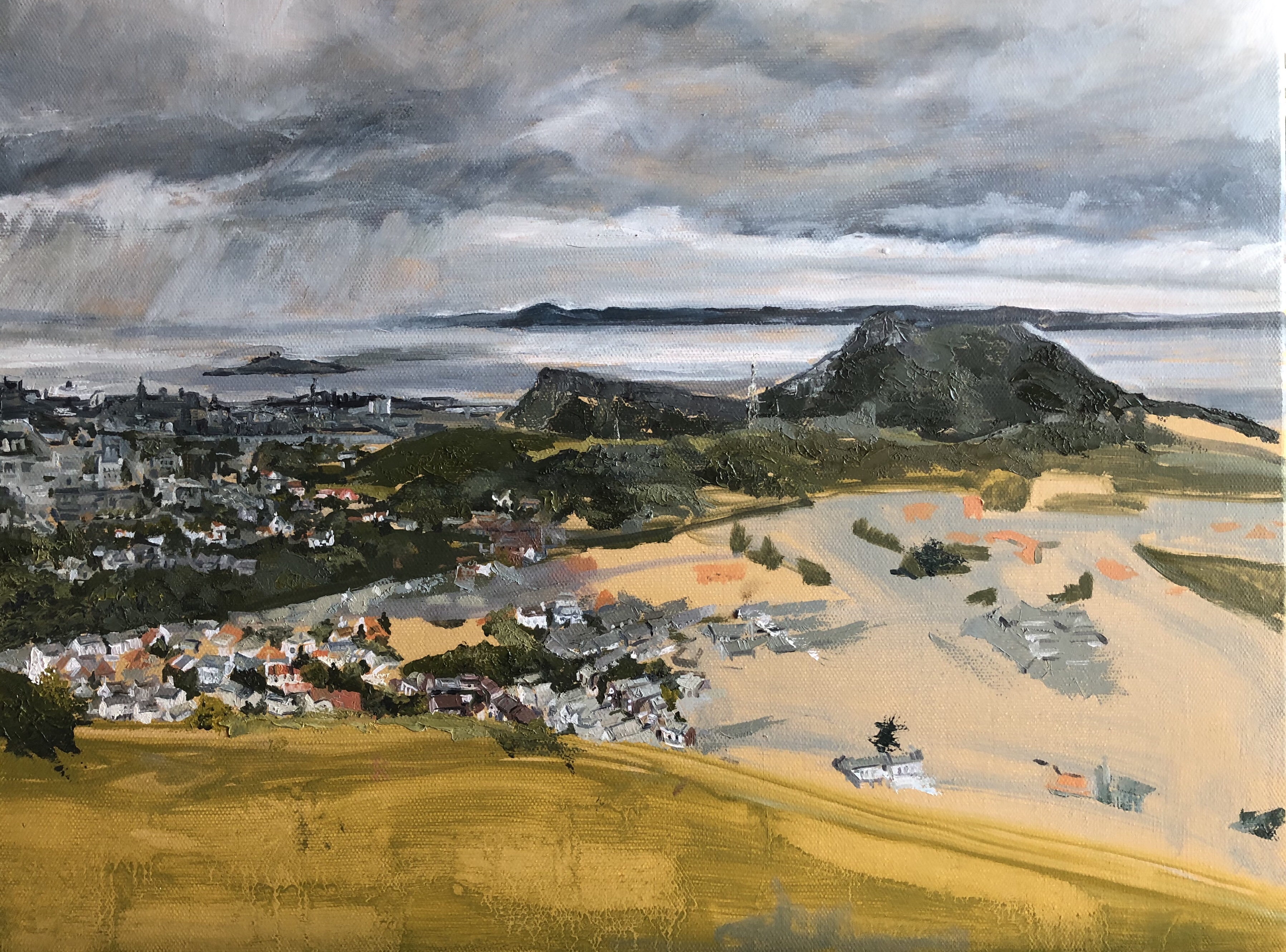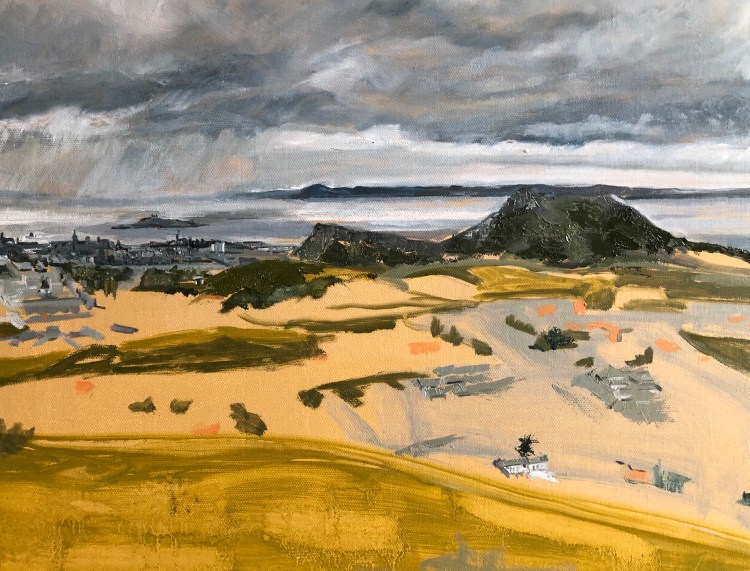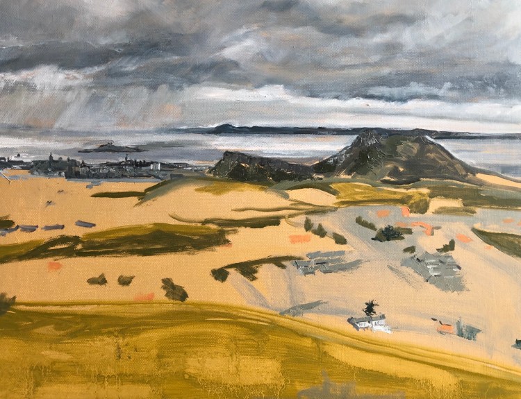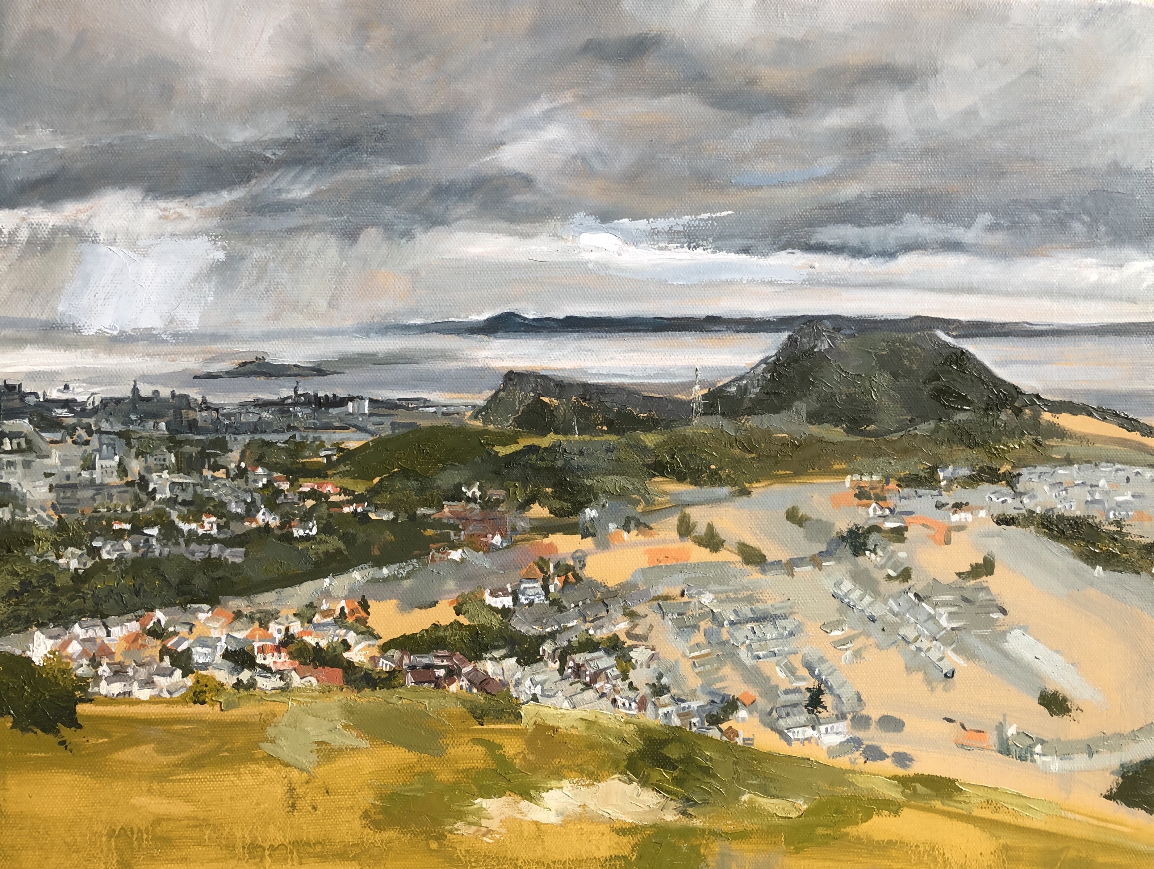 Taking a break from scenes from the north of Scotland and returning to Edinburgh, my current work is the city as seen from the Pentland Hills. The weather was fine on this side of the Forth unlike Fife to the north, where rain clouds were gathering. Arthur’s Seat, Salisbury Crags and the Old Town seem to be shrouded in darkness in contrast to the light reflected off the sea beyond.