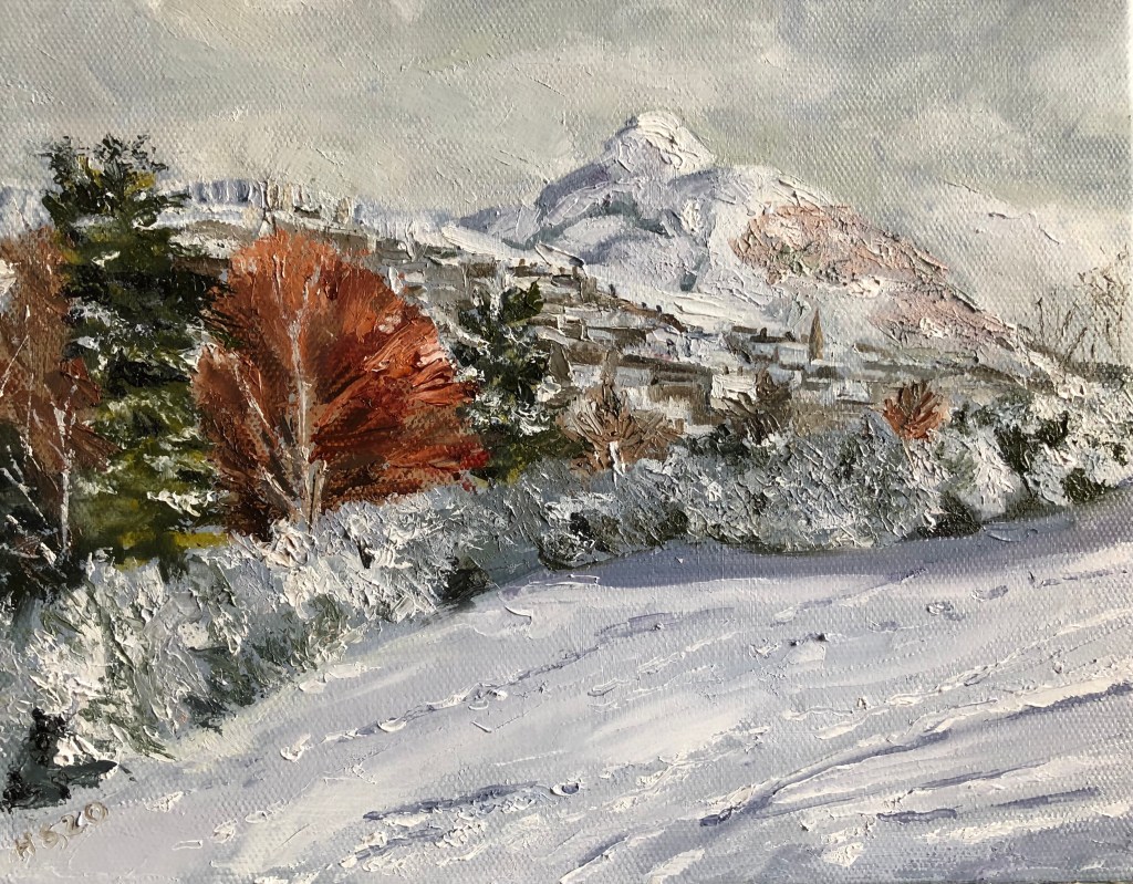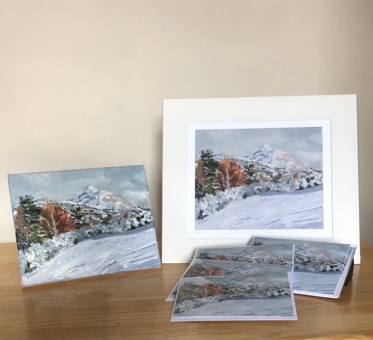 An original oil on canvas available for sale as a signed, limited edition Giclee print or Christmas card. This wintery scene was inspired following a walk on Blackford Hill in Edinburgh. Evidence of skiing and sledging can be seen in the tracks in the snow while the looming presence of Aruthur’s Seat can be seen in the distance.