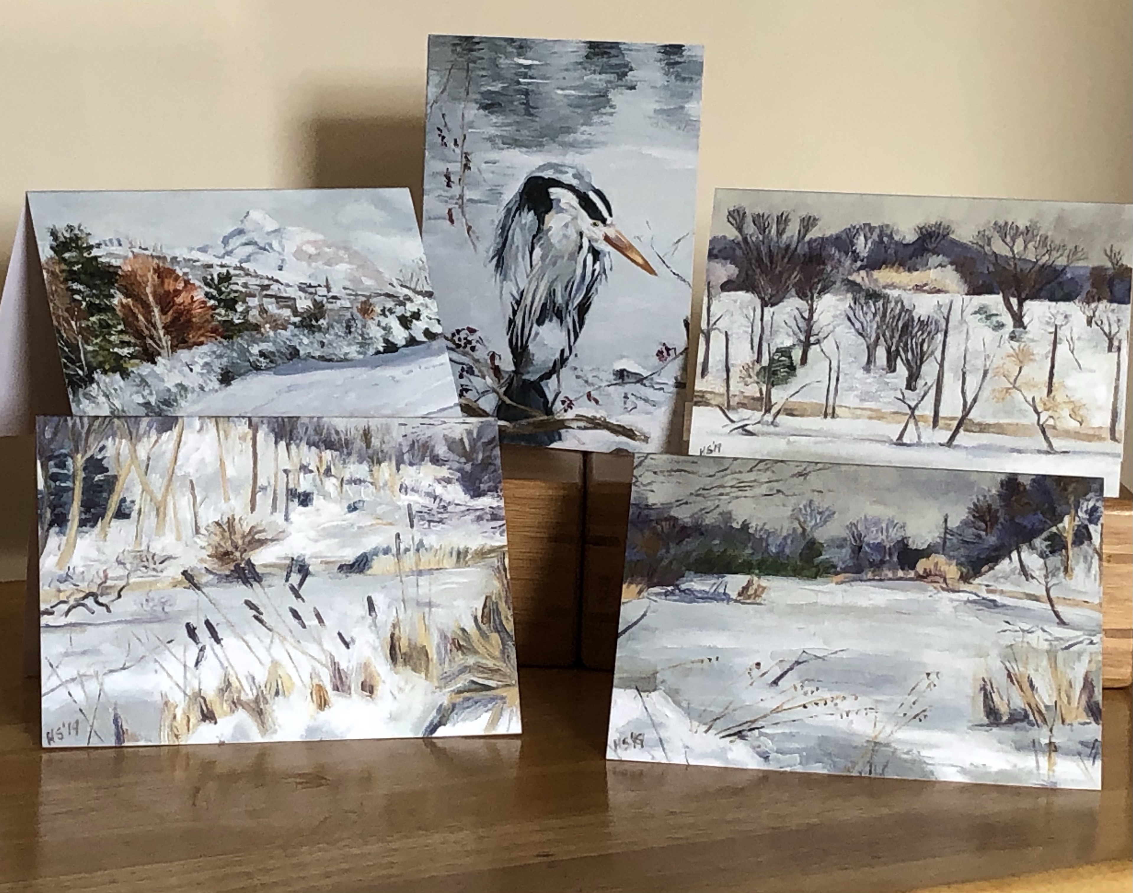 A selection of 5 winter-themed Christmas cards from original oil paintings by Helen Smart. Cards measure 5” x 7” and come supplied with envelopes. Available as a single card or as a pack of 5 from the cards page.
