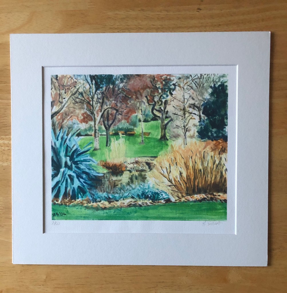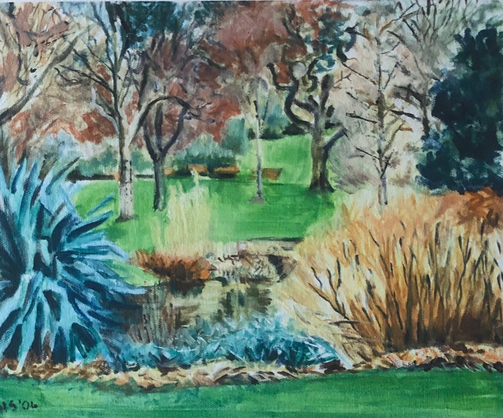 One from the archives but an old favourite. Created in 2004, this acrylic on canvas shows Edinburgh’s Botanic Gardens on a cold January day. Even in the depths of winter there is colour to be found in the plants and grasses. The trees in the background form a background of varied shapes and textures. Available to buy as a limited edition Giclee print.