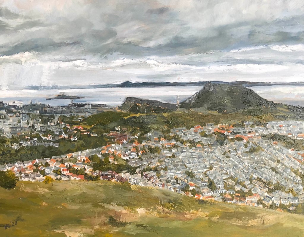 I started this piece in August and, what with a few interruptions for commissions, it has taken until today to get it finished. I now have a love/ hate relationship with it. My inspiration for starting it was in the quality of light in the sky and the river. Despite my best efforts I found myself being drawn into the detail of the townscape, losing sight of the big picture. I think it will take a while for me to ‘see’ the whole piece without fretting over the little things.