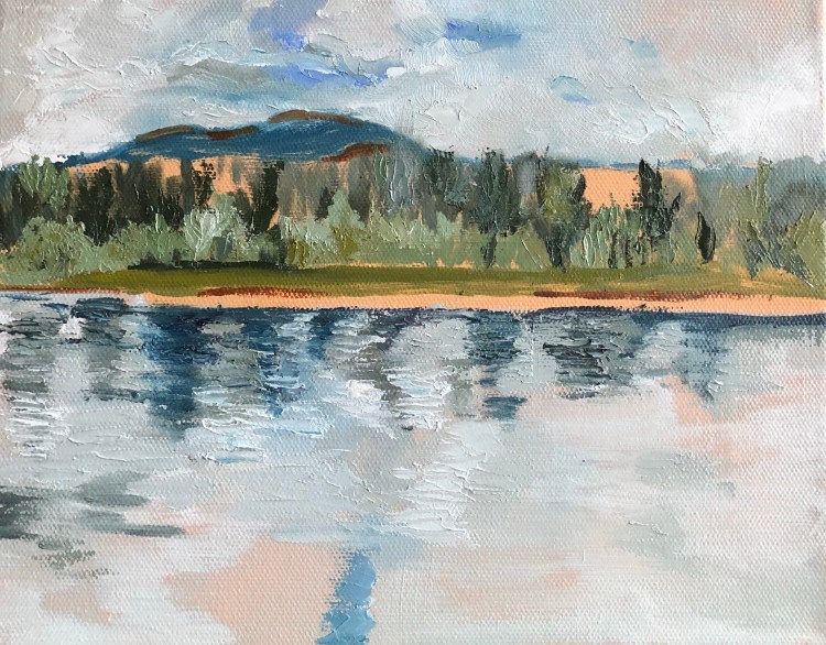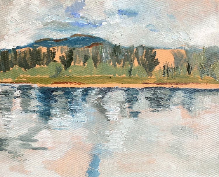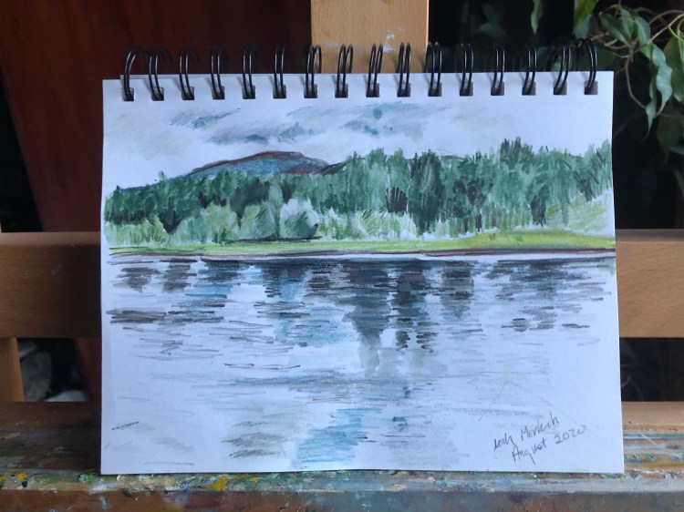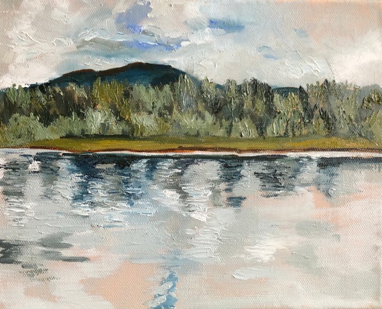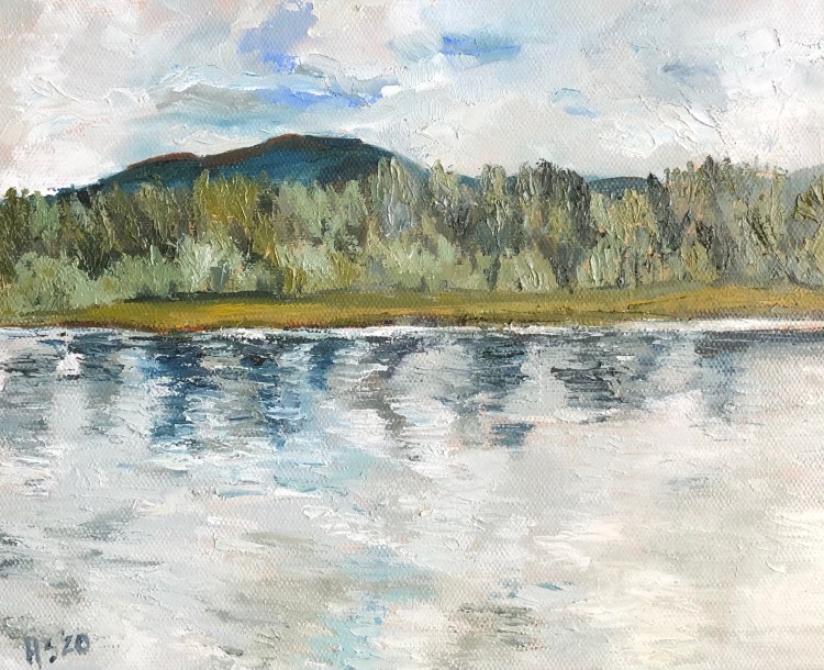 The finished piece, completed in what seems like record time after the marathon of Clouds over the Forth. I’ve made liberal use of a palette knife to apply the pigment to this painting, to create texture in the water and trees. The overall mood of the work is subdued with just a hint of brightness in the sky as is common in the Scottish Highlands.
