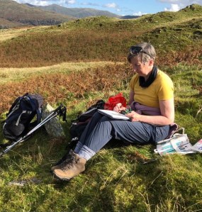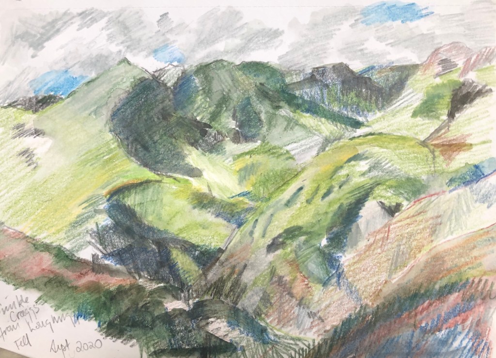 Continuing with the mountain theme but back to the Lake District for this one. It was a lovely summer’s day when I made the original sketch from the top of Loughrigg Fell earlier this year. I’ve stopped here before, en route from Clappersgate to Grasmere, for a bite of lunch and to do some drawing, but more often than not have had to abandon the process because of rain or a gale force wind. The views from this vantage point are stunning whichever direction you look. For this piece I’m looking toward Crinkle Crags, Bow Fell and the Langdale Pikes.