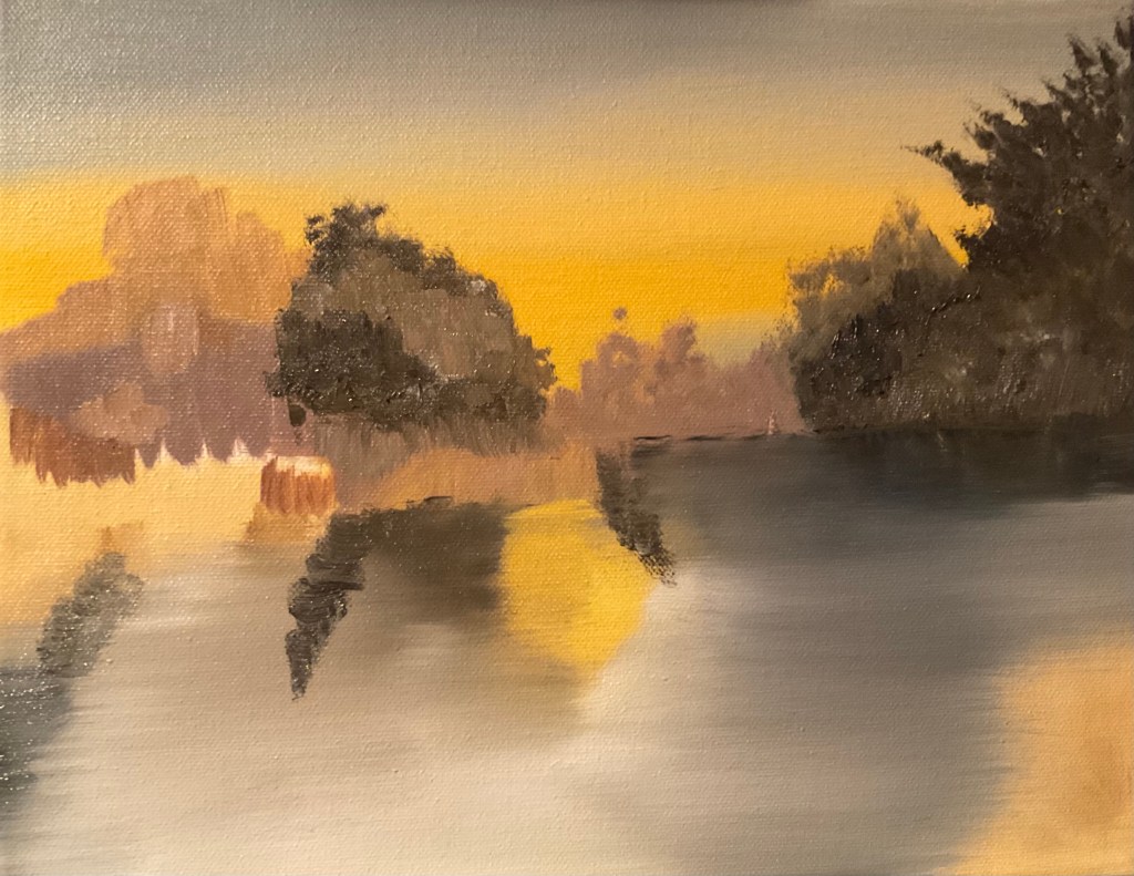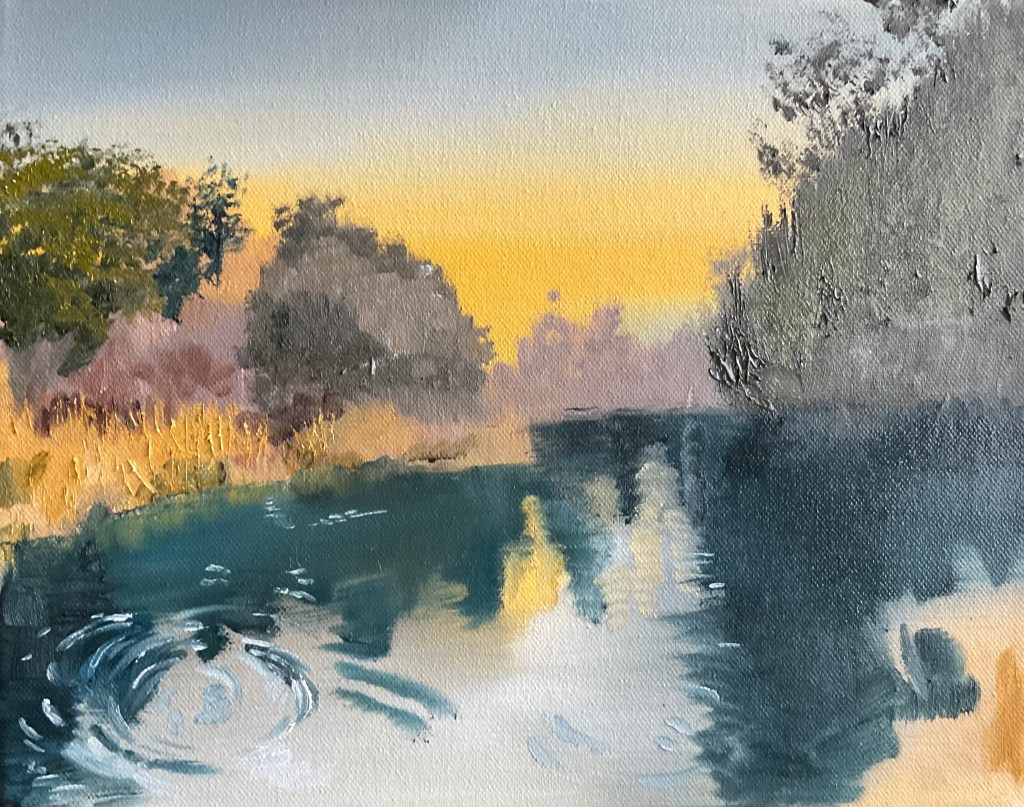 Inspired by the beautiful winter sunsets we had a few weeks ago, I’ve started an oil painting based on a watercolour sketch of the pond, a superb feature of the gardens and a focal point for visitors. I want to capture the pond, framed by the dark trees and the calm of the water, disturbed by only a few ripples as the ducks go about their business. the trees also form spectacular silhouettes agains the evening sky.