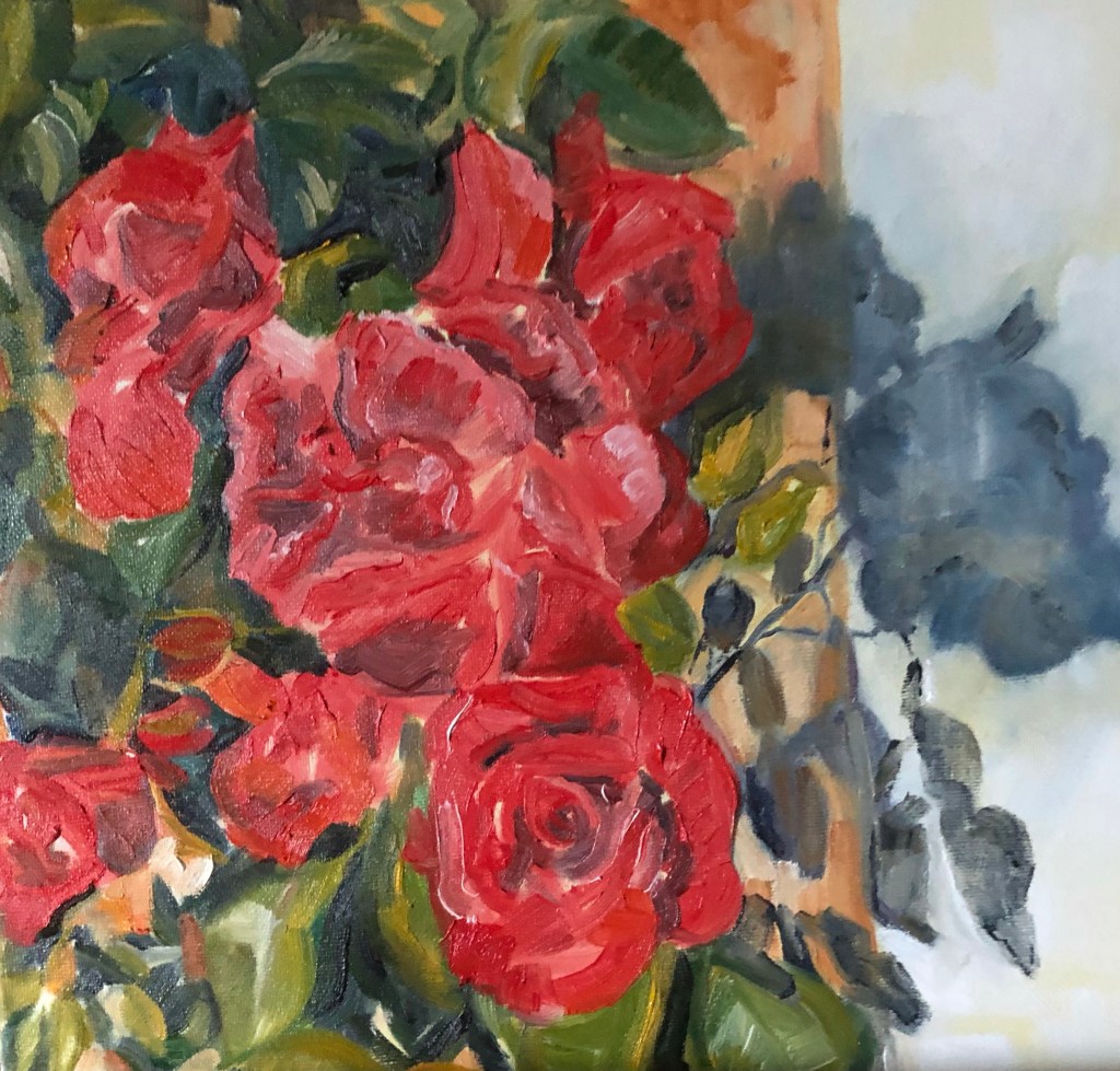 Stages along the way to the finished piece which you can see below. Overall I am pleased with the result but there is always room for improvement. I like the limited palette and will probably continue in this vein for my next few paintings. I have taken possession of a very large garden so there is plenty to inspire.