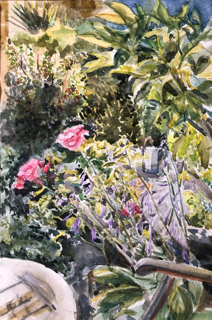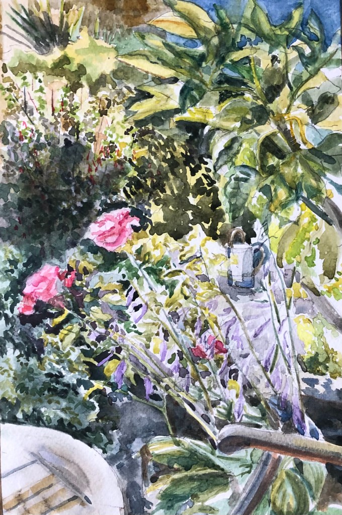 I feel I’ve captured some of the sense of growth and heat in the garden on this warm day. Not sure I have quite depicted the contrast between light and shade as well as I would have liked or the translucency of the foliage in the sun. This is partly because of my tendency to ’overwork’ an image if I don’t get it right straight away. I need to learn to live with, what I consider to be mistakes; at the very least to use them as learning opportunities.