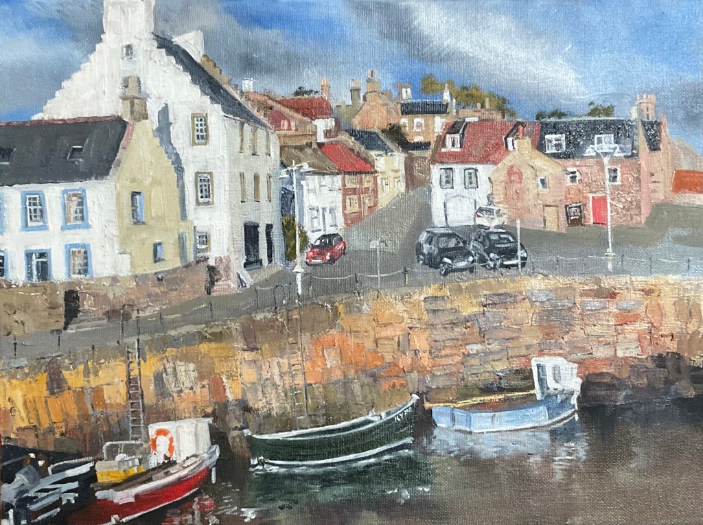 A second reason is also a nod to a family member. My uncle took up painting when he was in his seventies and one of his subjects was Crail harbour so it is something of a family tradition. The painting has been executed from almost the same vantage point. Not much has changed since it was painted -fewer cars, boats facing a different direction. I’ve always liked this painting and it hangs in my hall at home.