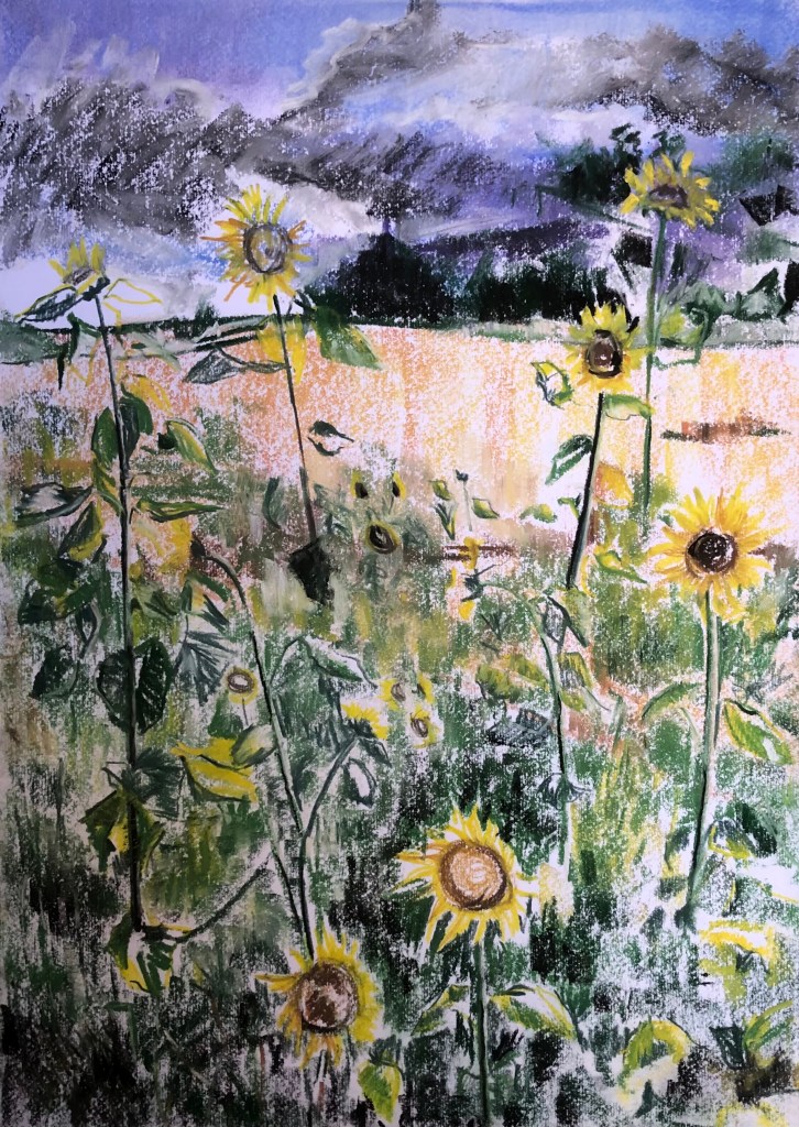 As the summer starts to fade, sunflowers are a cheering sight. This year, the land behind my house has been given over to oats and a large strip around the perimeter sown with a variety of different seeds which have flowered in succession over the summer. Now the sunflowers have taken centre stage, just asking to be painted. Here are two attempts to capture them in all their glory.