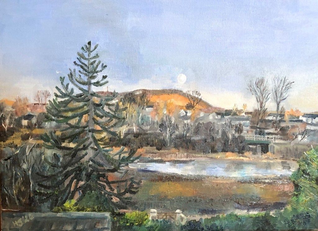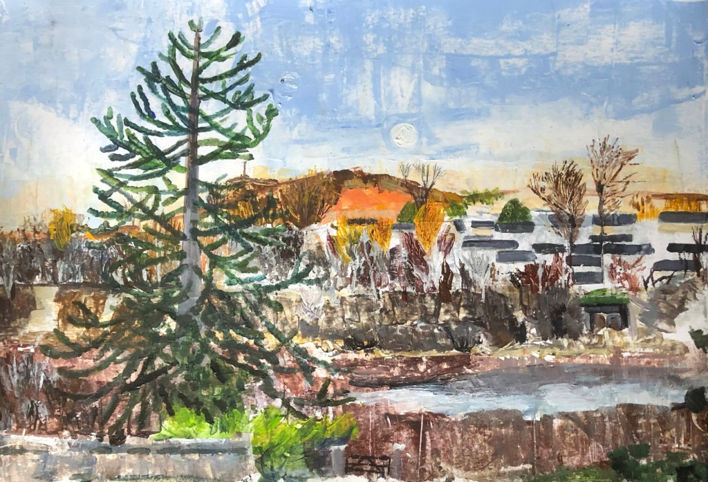 Oil on canvas version of a previous study of the same view. This works better for this image I think. In the previous piece, I used acrylic on paper coated with an acrylic medium. This resulted in a very textured piece which was not the ‘feel’ I was looking to create.