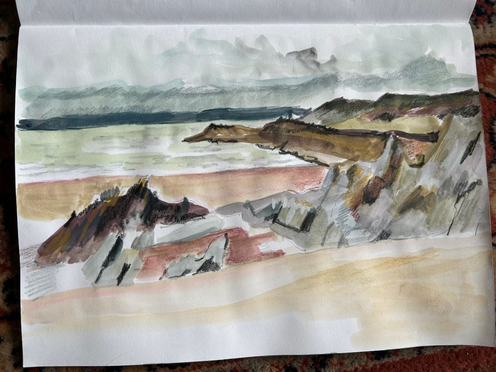 To begin with, I created sketches from the photographs I had taken. I often do this if I haven’t sketched ‘en plein air’ to create some distance from the detail that a photograph typically captures. I also use this process to create a colour palette that reflects my impression of the scene. I chose large canvases for the final paintings as they offer greater scope to portray the broad expanse of the Galloway countryside and seashores. My chosen medium was oils, which are easier to blend and better capture the nuances of the shifting cloudscapes, seas and countryside.