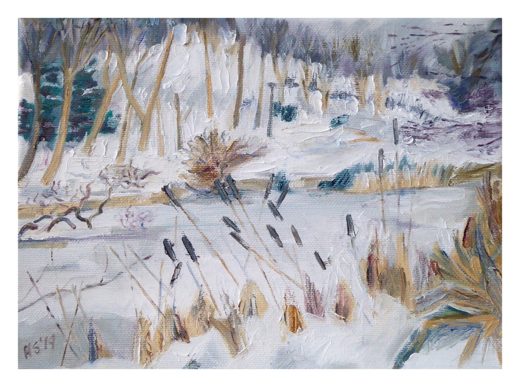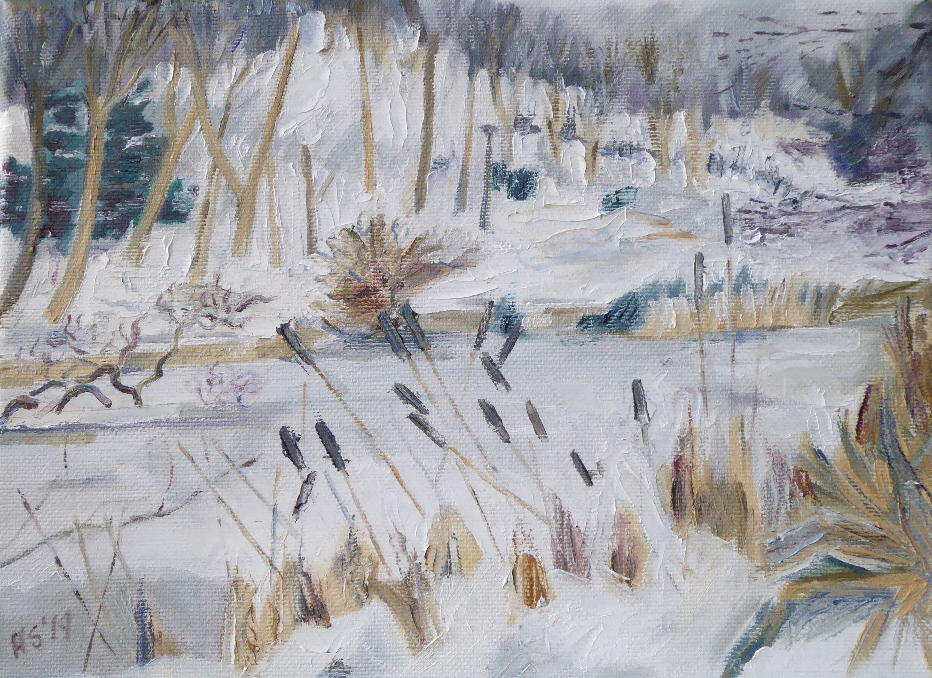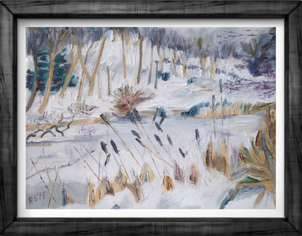 Bullrushes at the edge of a frozen pond. 23cm x 17cm limited edition print on high quality paper. Supplied unframed and unmounted. Free postage and packing for orders within the UK. For prices to ship overseas, please contact me at artbysmart4@gmail.com
