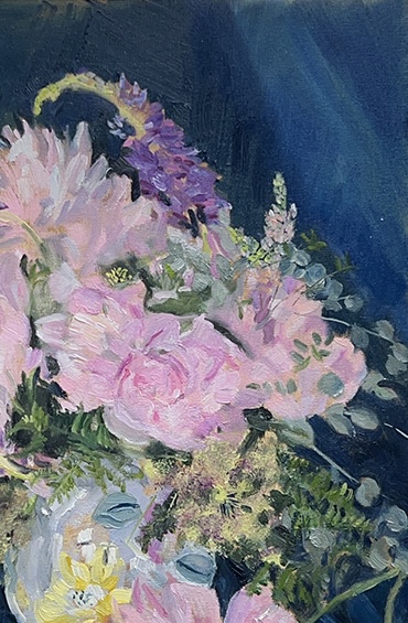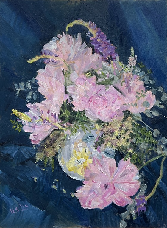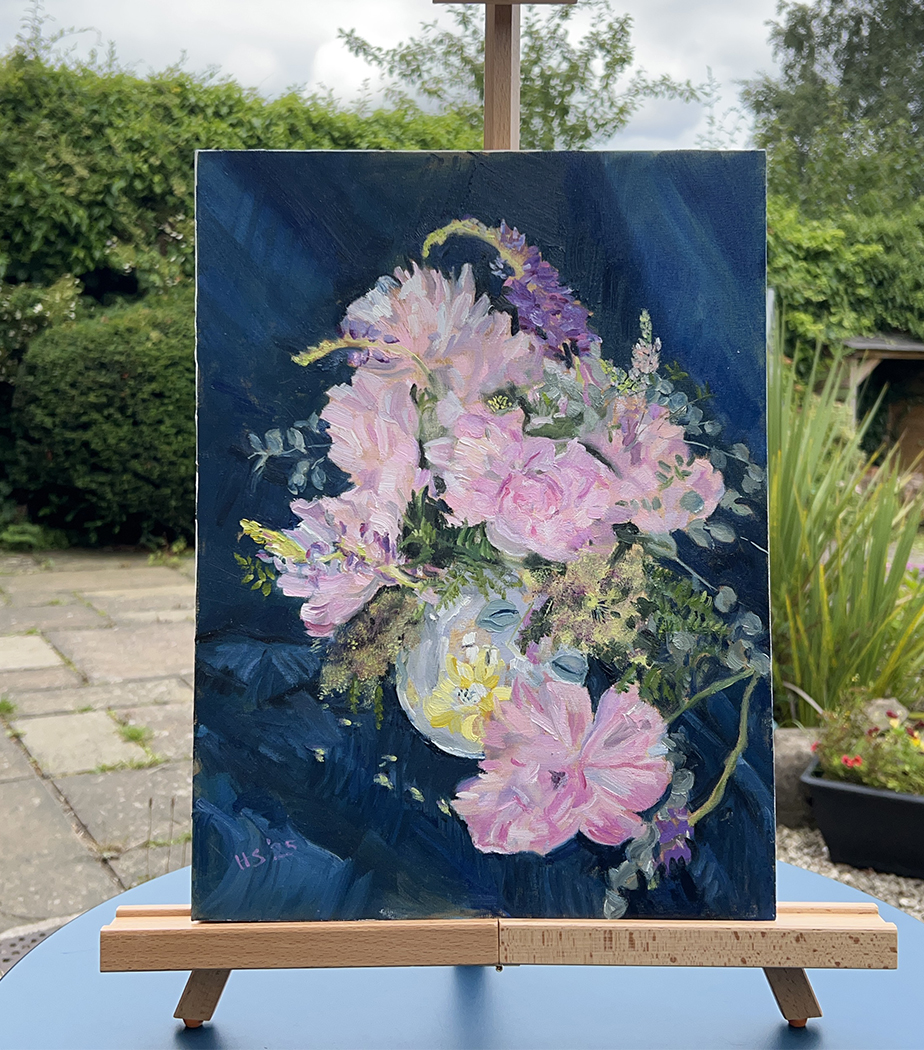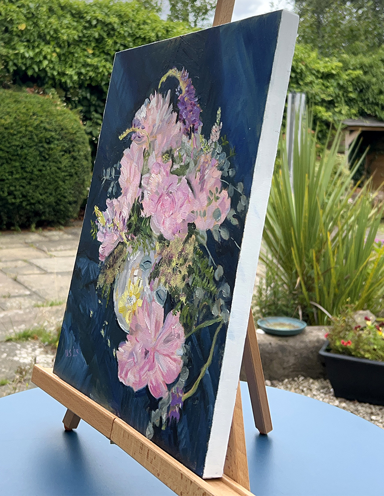 A spring bouquet painted in oils on canvas. Measuring 12” x 16”, this painting is supplied unframed and is signed on the front and back. Postage to destinations within the UK is free. For shipping prices to other destinations please contact me at artbysmart4@gmail.com