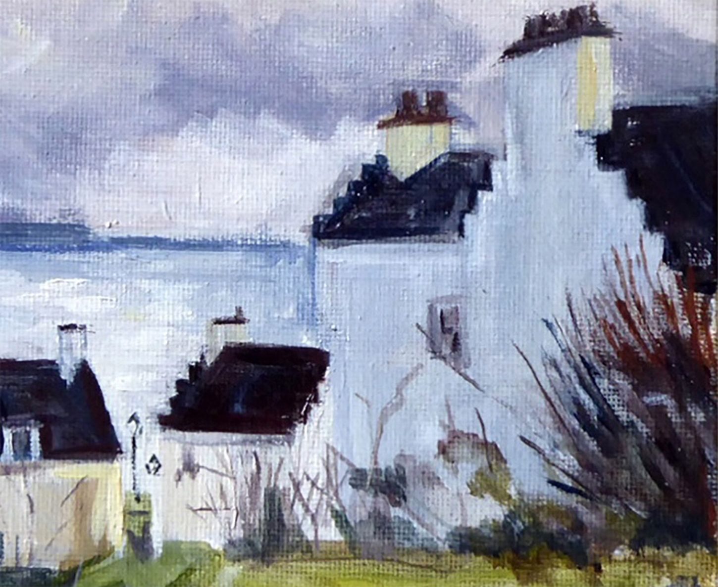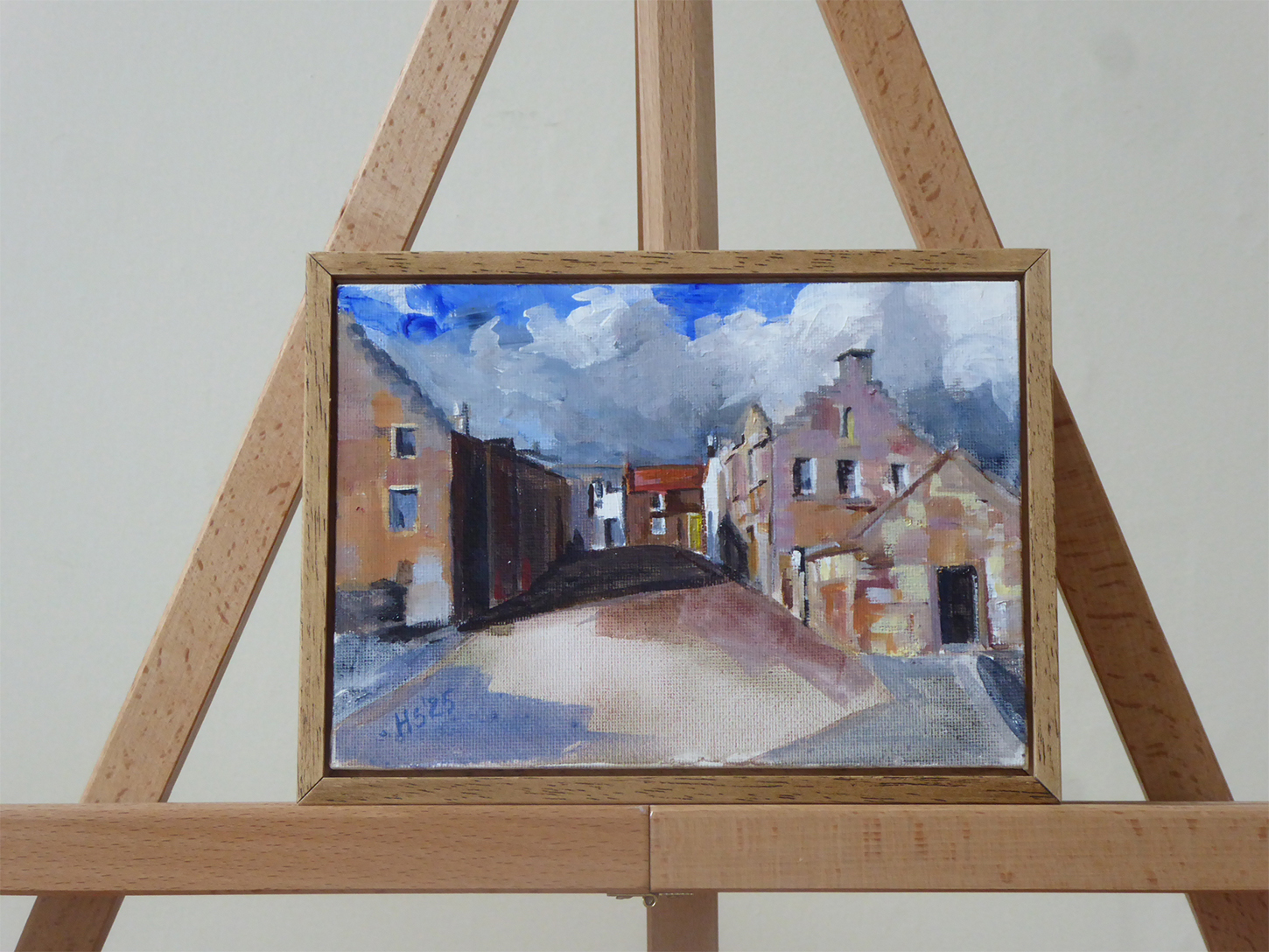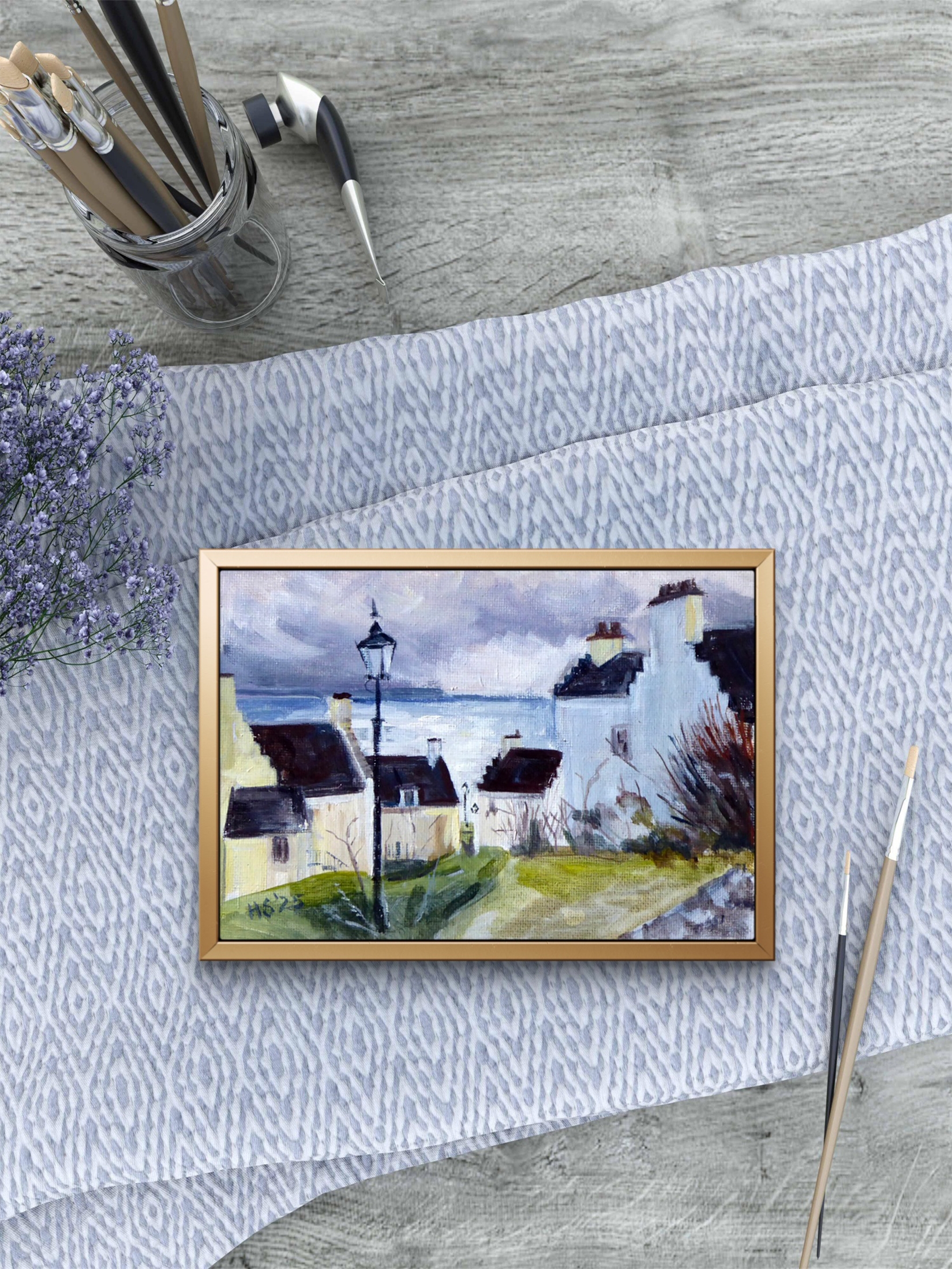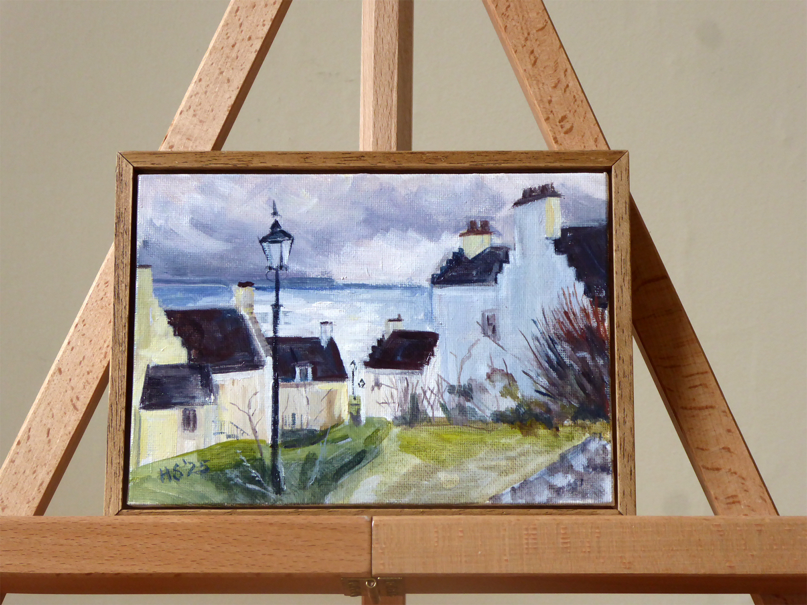 The picturesque village of Pittenweem in the East Neuk of Fife: this small oil on board measures 7” x 5”. It is supplied framed and ready to hang and is signed on the front and back. Postage to destinations within the UK is free. For shipping prices to other destinations please contact me at artbysmart4@gmail.com.